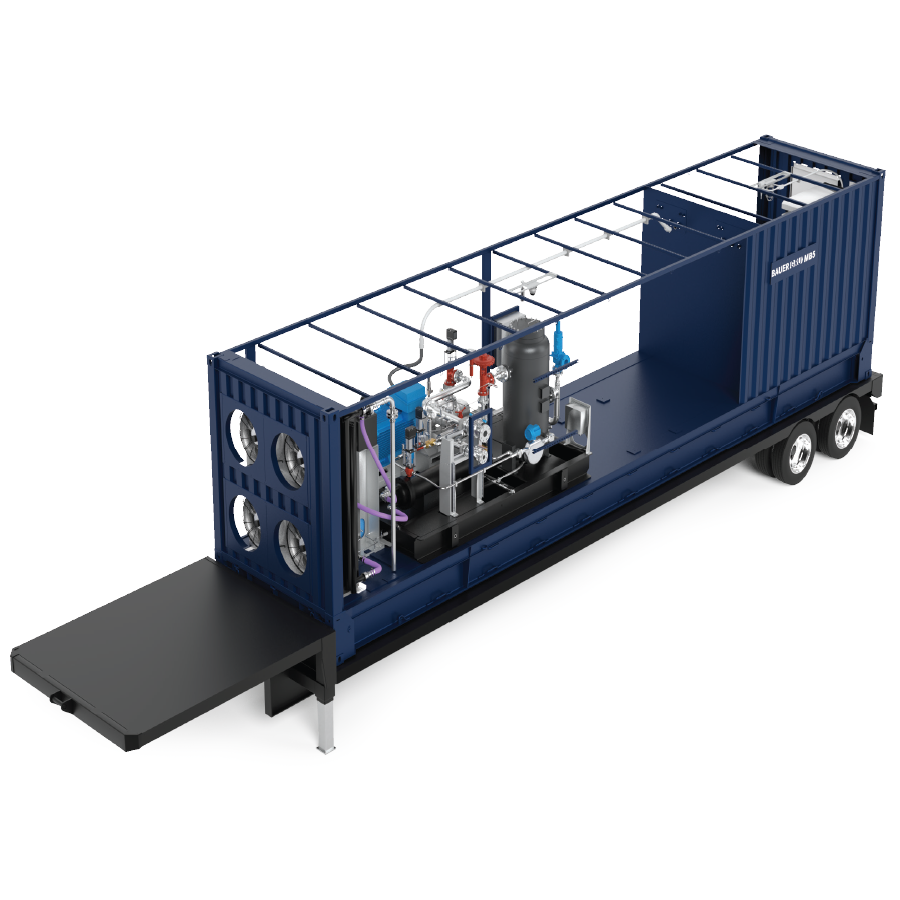 - In mobile field applications, the electric drive BAUER GRU® blowdown compressor systems can be powered by a standard mobile Natural Gas generator set.