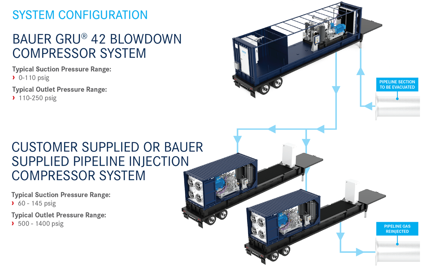 The BAUER GRU® 42 Rotary Screw Blow-down Compressor System is designed to efficiently take pipeline residual pressure from 110 psig down to 5 psig while feeding high-pressure reciprocating booster compressors at their optimal suction pressure to maintain their maximum flow performance. This allows the pipeline blowdown operator to not only take residual pipeline pressure close to zero to meet their customers’ ESG requirements, but to also significantly reduce blow down time in order to satisfy their customers’ tight time-line requirements.