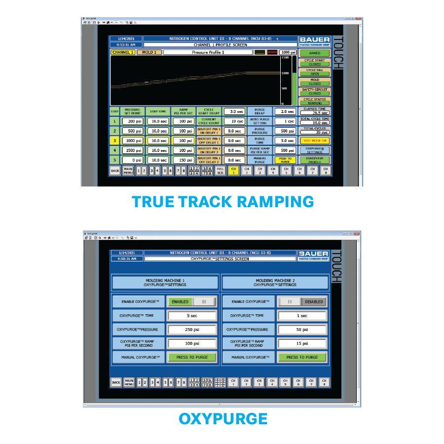 BAUER's True Track Ramping technology provides the ability to precisely control the gas injection profile. The processor can program set points to control the rate of gas pressure increase and decrease during each step of the gas injection cycle. With True Track Ramping, you can prevent gas blow through and minimize gas permeation into the thin wall sections of the part.
