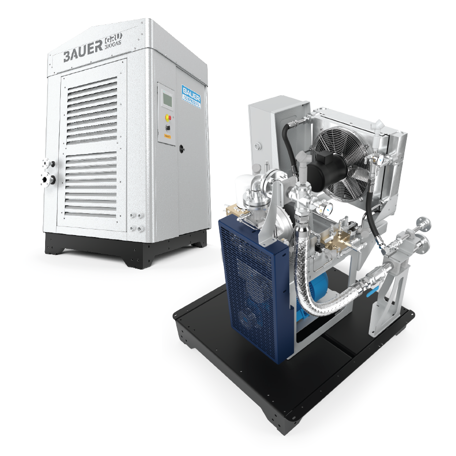 The BAUER GRU® Biogas Recovery Compressor range has been specifically designed for methane recovery and conditioning in biogas applications. The function of the biogas recovery compressor is to elevate the pressure of the incoming biogas from 1-7 psig (typical) to 90-230 psig, which is the operating pressure requirement for most PSA/membrane-type gas conditioning systems. BAUER offers a complete BAUER GRU® system size range from 10 HP to 750 HP (7.5-560 kW).