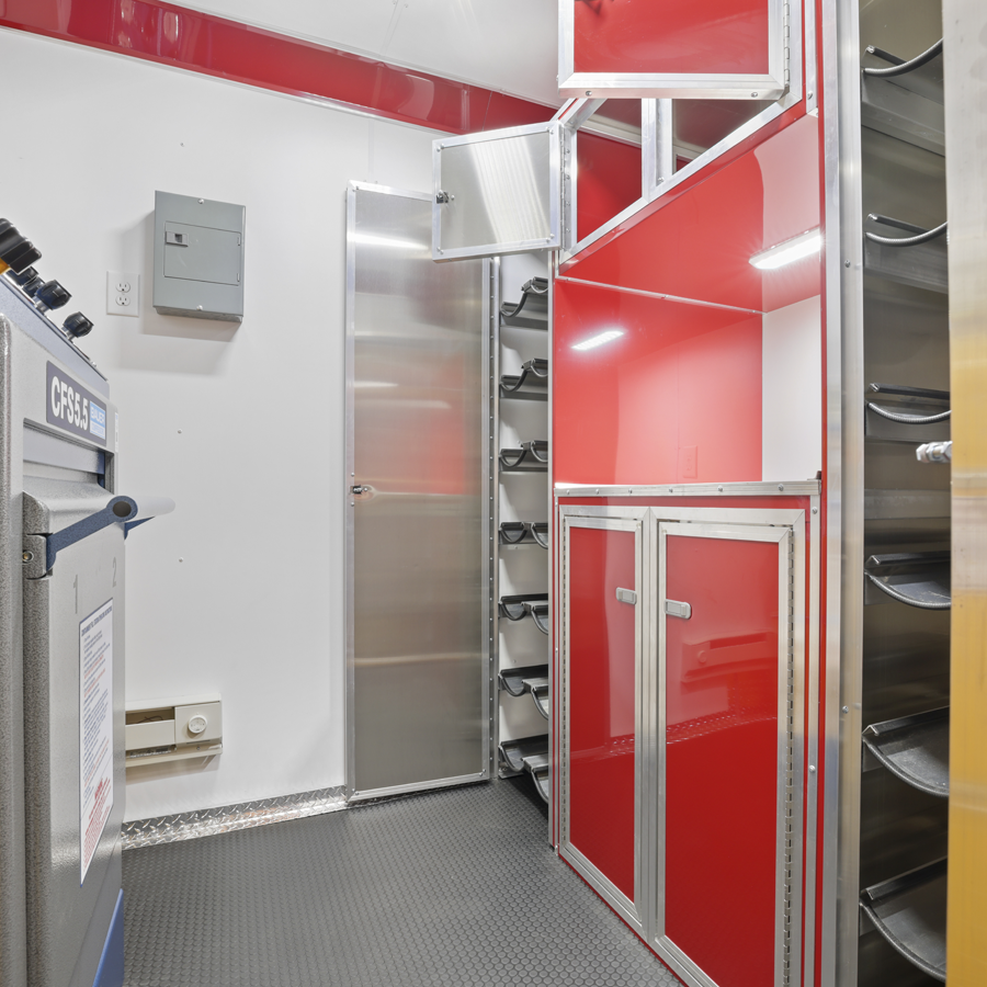 The SCBA rack has space for 14 spare bottles. Built-in cabinets can hold spare SCBAs, masks, parts, first-aid kits, Haz Mat gear, communication equipment, and more. Electrical power assures that all battery-operated devices can be fully charged.