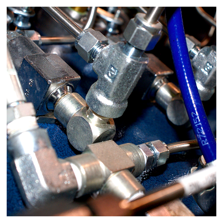 Each high-pressure distribution system is carefully designed to include pressure indicating devices and safety, isolation, vent and drain valves as required. All panel mounted devices are clearly identified with labeling. More complex systems include a schematic diagram as part of the labeling for operator reference.